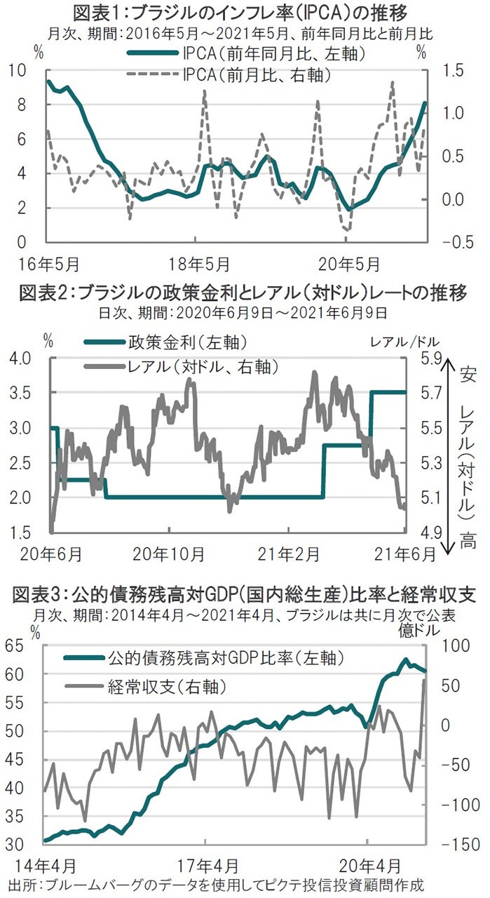 なお、ブラジル中央銀行は6月16日(日本時間17日早朝)に金融政策会合の決定を公表することが予定されています。ブラジル中銀は3月と5月の会合で政策金利を0.75%引き上げ3.5%としました(図表2参照)。インフレ率の上昇傾向が続いていることから、市場では次回会合において再度の利上げが予想されています。