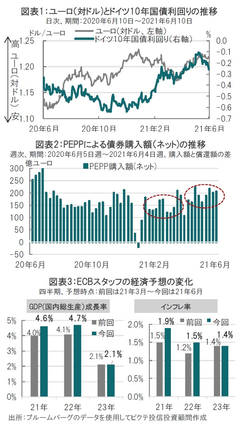 ECBの経済成長予想を見ても21年、22年を4.6%、4.7%とそれぞれ上方修正しています(図表3参照)。インフレ率の基調はほぼ変わっていないと見られますが、変化の兆しは見られます。PEPPを巡るECBの姿勢を占う上で、今後はECBが秋に予定している「戦略的見直し」の内容と、米国が(恐らく先となる)出口戦略の議論の開始や市場の反応を踏まえて、じっくり構える姿勢と思われます。