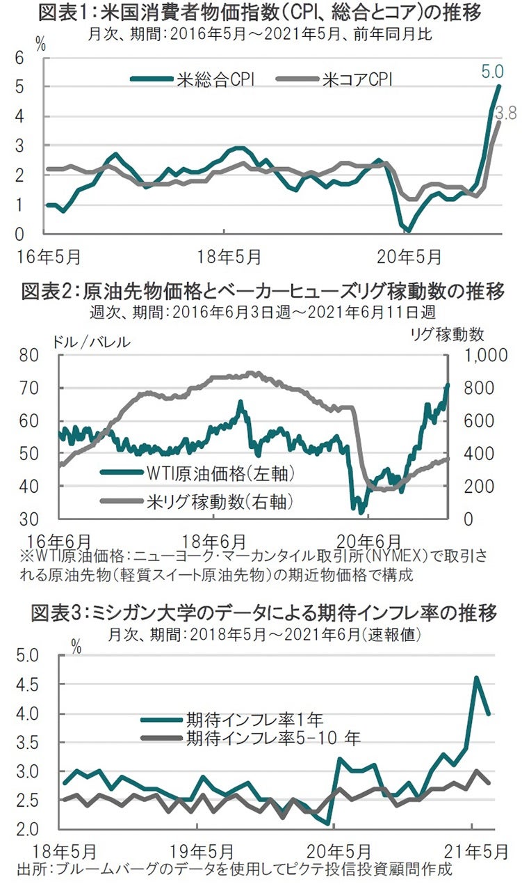 一月ほど前に、米国4月の消費者物価指数(CPI)が大幅な上昇となったときには、インフレ率の上昇が一過性なのか否かを巡って意見が分かれていた印象です。しかし、時間の経過と共に市場では、現局面でのインフレ率の動向については上昇は一過性との見方が優勢となっています。ただインフレ率の今後の動向には注目すべき点もあると思われます。