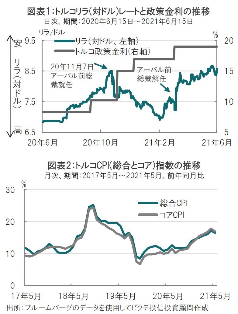 トルコ中央銀行は2021年6月17日に金融政策決定会合を開催することを予定しています。市場予想は主要政策金利の1週間物レポ金利を年19%で据え置くことを見込んでいます(図表1参照)。