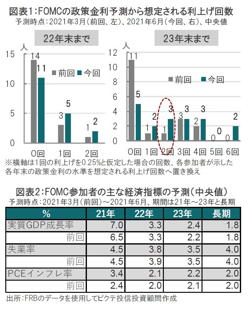 今回の米連邦公開市場委員会(FOMC)では、ドットチャートの変化、経済見通し、テーパリング(債券購入の縮小)議論の開始の有無の3点に注目していましたが、公表された内容ではいずれもがタカ派(金融引締めを選好)的でした。特にドットチャートでは利上げ時期前倒しの可能性も示され、今後は従来より利上げ時期を意識した市場展開が想定されます。