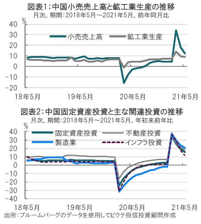 小売売上高は前年同月比12.4%増と、市場予想(14.0%増)、前月(17.7%増)を下回りました(図表1参照)。鉱工業生産も同8.8%増と、市場予想(9.2%増)、前月(9.8%増)を下回りました。固定資産投資は年初来前年比で15.4%と、市場予想(17.0%増)、前月(19.9%増)を下回りました(図表2参照)。中国の主要経済指標は軒並み市場予想を下回り、景気回復のペースに減速感が見られました。