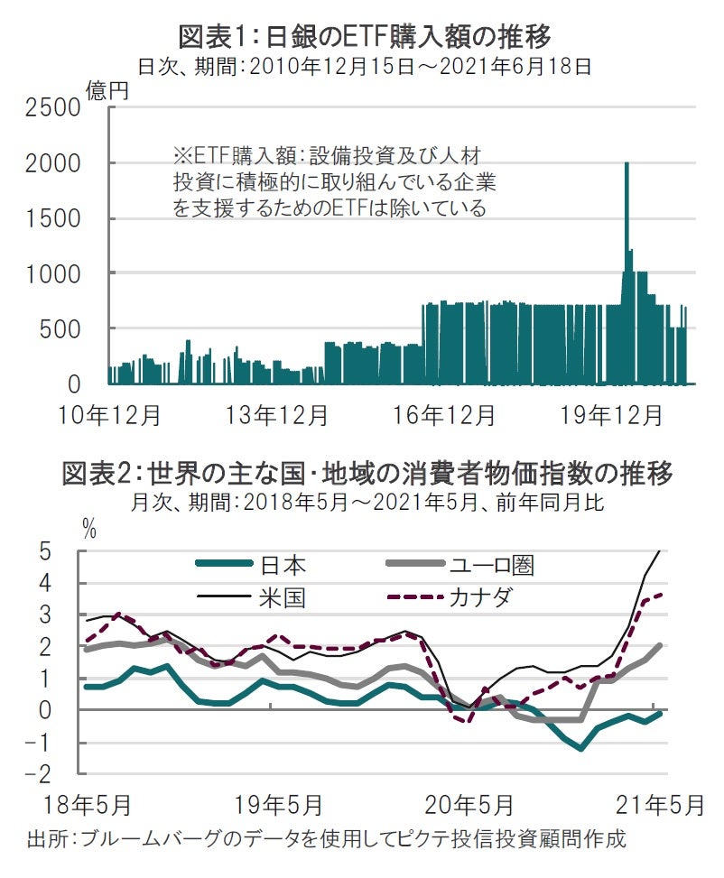 日本銀行は2021年6月17-18日の金融政策決定会合で市場予想通り主な金融政策を概ね据置くことを決定しました。短期金利をマイナス0.1%、長期金利の指標になる10年物国債利回りを0%程度に誘導する長短金利操作(イールドカーブ・コントロール)は現状を維持しました。年12兆円を上限に上場投資信託(ETF)を必要に応じて買い入れるといった市場安定策も継続しています(図表1参照)。