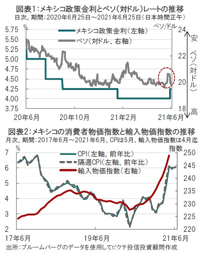 メキシコ銀行(中央銀行)は2021年6月24日に開催した金融政策決定会合で、政策金利を0.25%引き上げて4.25%にすると発表しました(図表1参照)。利上げは18年12月以来、2年半ぶりとなります。