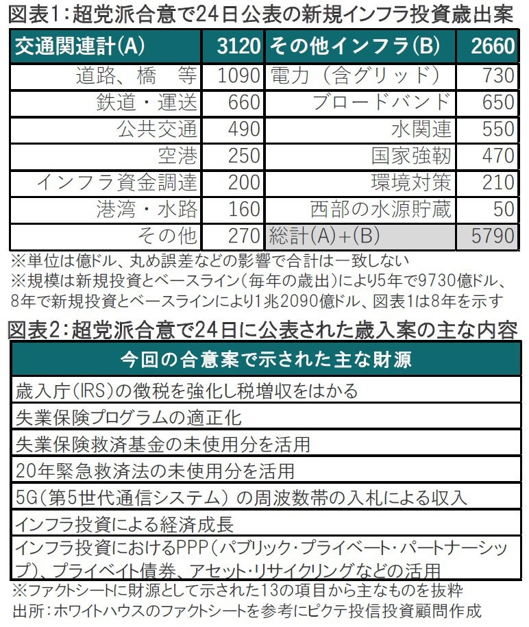 バイデン政権は3月末にインフラ投資を主体とする米国雇用計画を発表しました。今回の超党派によるインフラ投資法案の合意は、共和党が米国雇用計画のなかで賛同できる項目であるインフラ投資(ハードインフラ)を中心にまとめた内容です(図表1参照)。なお、同合意案は、共和党が反対している「人的インフラ」が含まれていません。バイデン政権は人的インフラを別の法案で並行して進める方針です。