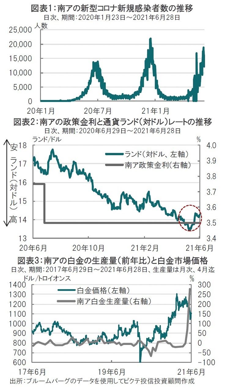 南アフリカのラマポーザ大統領は2021年6月27日、インドで初めて確認された新型コロナウイルスの変異株(デルタ株)による感染第3波の拡大を受け、新たなロックダウン(都市封鎖)措置を発表しました(図表1参照)。