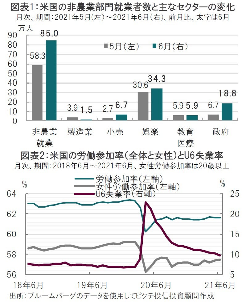 米労働省が2021年7月2日に発表した6月の米雇用統計で非農業部門就業者数は前月比85万人増と、市場予想の72万人増、前月の58.3万人増(速報値55.9万人増から上方修正)を上回りました(図表1参照)。