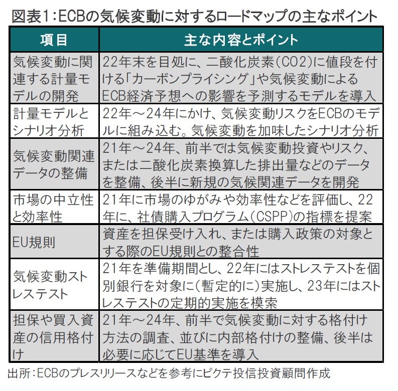 積極的と見られるのがECBです。ECBが7月8日に発表した気候変動の行動計画では、気候変動の工程表が示されています(図表1参照)。ここでECBを積極的と表現したキーワードは主体性とも言い換えられます。ECBは気候変動問題に対して、自らがデータを収集、分析し、気候変動問題に取り組む企業の社債購入を自ら判断することなどが計画に盛り込まれています。