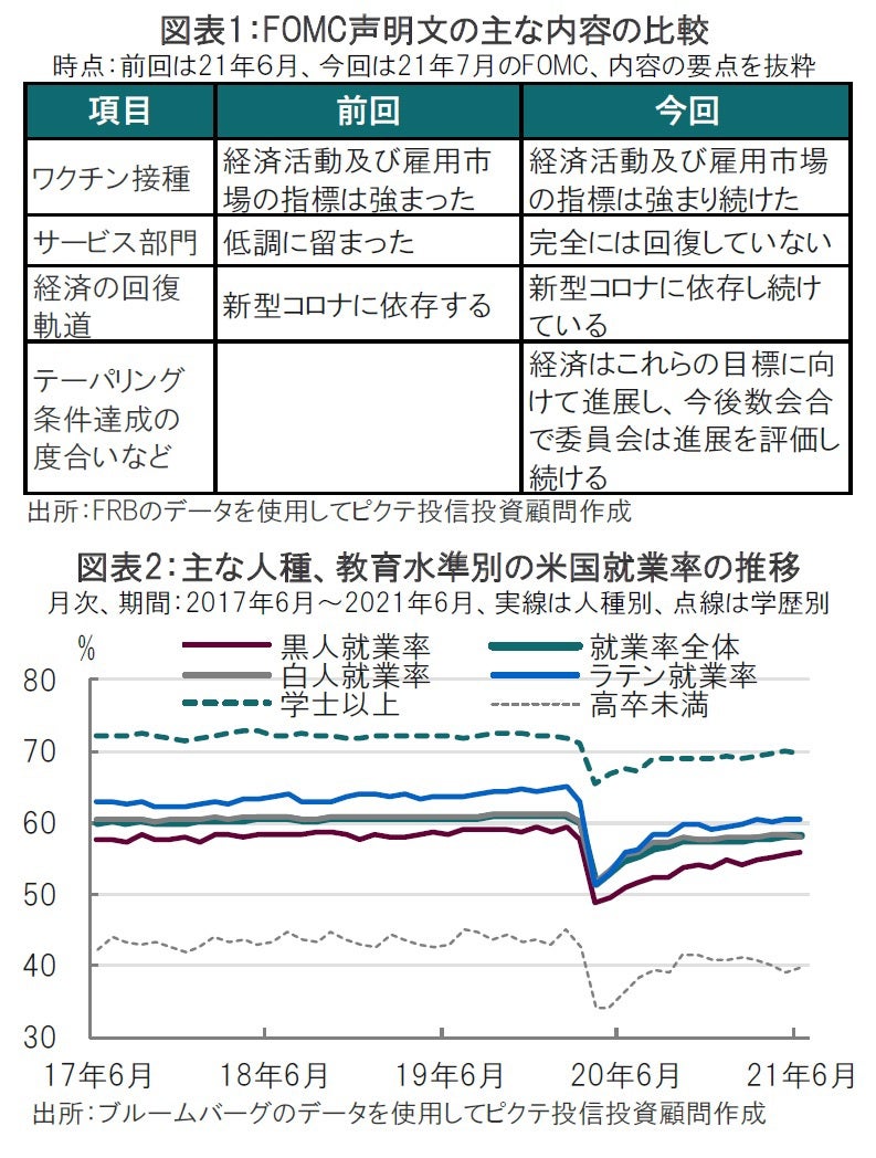 声明文では、経済は新型コロナウイルスのデルタ変異株が経済成長を脅かすリスクが高まっているものの、労働市場は力強さを増しているとの認識を示し、インフレが高進する中で債券購入政策の減額(テーパリング)を開始する時期が近づきつつあることが示唆されました(図表1参照)。
