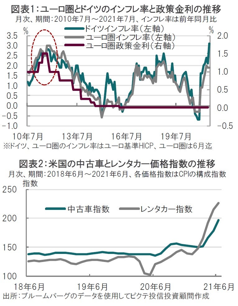 ドイツ連邦統計庁が2021年7月29日に発表した7月のドイツのインフレ率(HICP、速報値)は前年同月比3.1%と市場予想の同2.9%、前月の同2.1%を上回りました(図表1参照)。