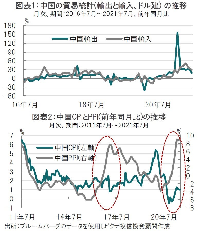 中国で月前半に公表された経済データのうち貿易統計と物価指標に注目すると、新型コロナウイルス後、中国経済をけん引してきた輸出に7月は減速感が見られました。また、輸入の伸びも鈍化し始めています。一方、中国の物価動向に目を転じると、資源価格を反映して卸売物価指数(PPI)は高水準での推移となっていますが、消費者物価指数(CPI)は落ち着いています。