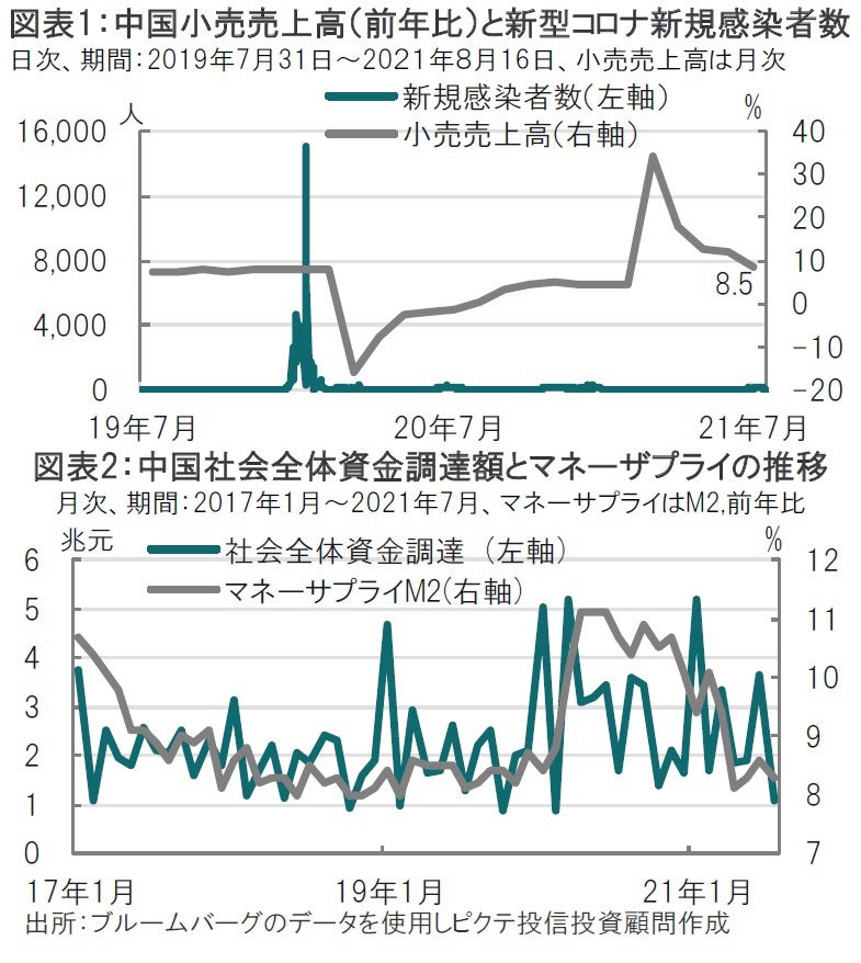 百貨店やスーパー、電子商取引(EC)などの売上高を合計した7月の小売売上高は8.5%増と、市場予想の10.9%、前月の12.1%を下回りました(図表1参照)。なお、飲食店の収入は14.3%増で、6月の20.2%を下回りました。年初来の固定資産投資は年初来前年比10.3%増と、市場予想や前月を下回りました。内訳を見るとインフラ投資や製造業投資が前月を下回り、固定資産投資の伸びを抑えました。