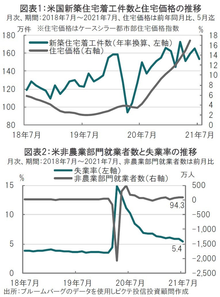 そのタイミングについて「ほとんどの参加者が今年中に購入額の減額を始めることが適当」とされています。市場でも同様の予想が増えたと思われます。もっとも議事要旨には当時(7月FOMC前)の市場の予想として来年1月の減額開始予想が多いと記述されています。減額開始の見込みが足元で若干前倒しになっている印象です。前倒しの背景は、一過性の要因が多いとはいえインフレ率の高止まり、労働市場が相当回復してきたという議事要旨の説明に加え、資産市場とりわけ住宅価格上昇への懸念もあげられます(図表1参照)。住宅価格の高騰が住宅着工を抑制している可能性もあることや物価への影響が懸念されます。住宅価格は物価指標には含まれませんが、帰属家賃も含めた賃料は住宅価格と連動する傾向もあるだけに、当局としても看過はできないと思われます。
