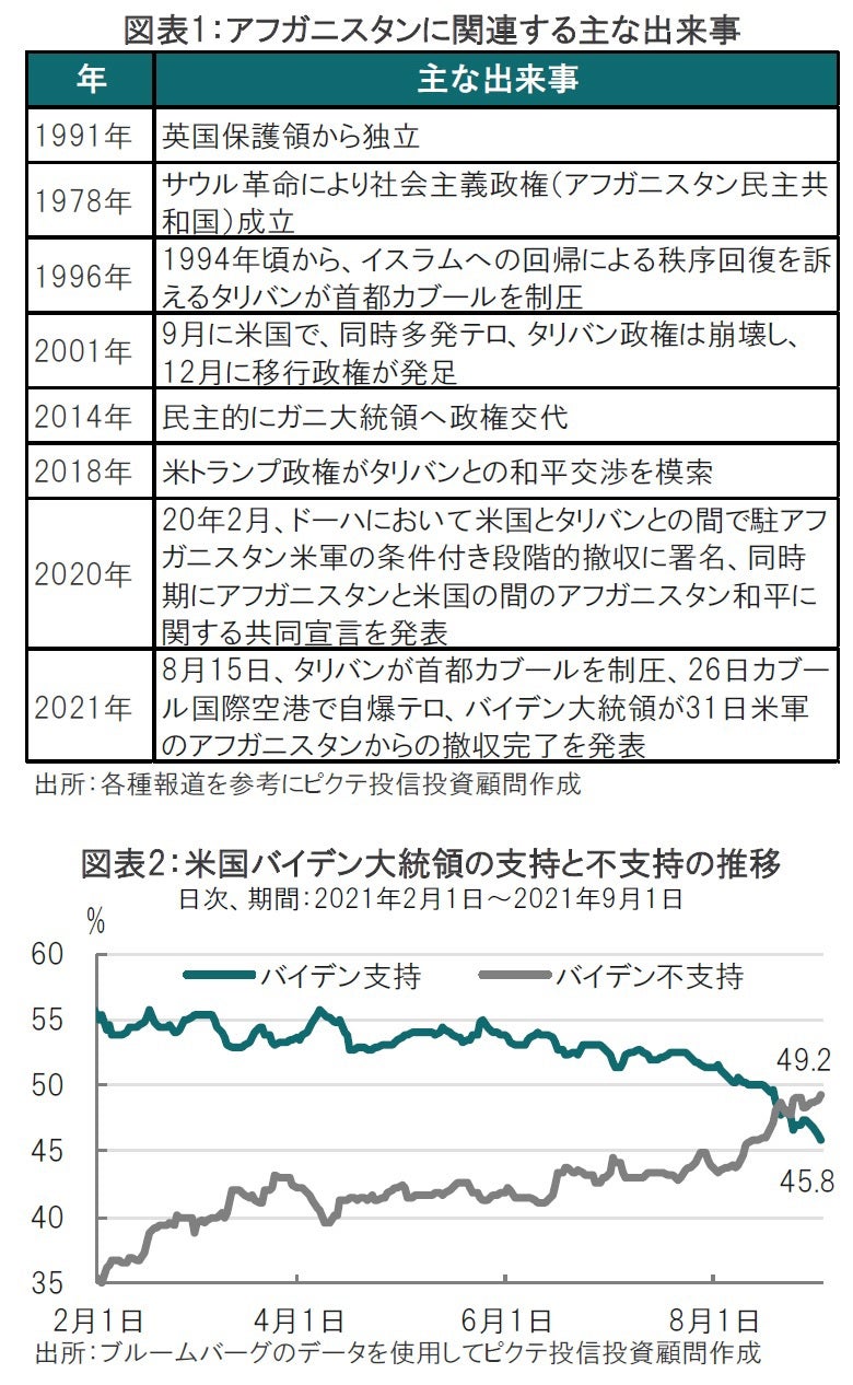 米国のバイデン大統領は2021年8月31日、アフガニスタン駐留米軍の撤収が完了したことを受けて国民向けに演説し、正しく、賢明かつ最善の決定だったと述べ(図表1参照)、撤収の正当性を主張しました。