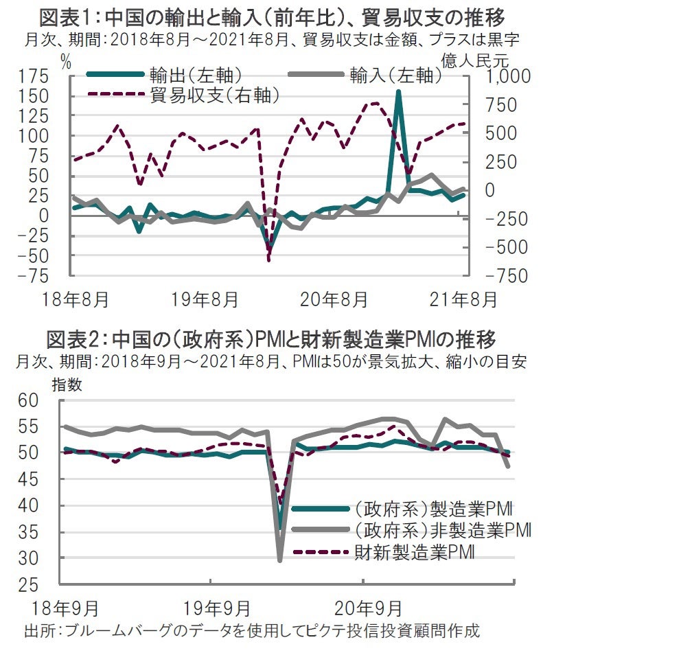 まず、8月の中国貿易統計の内容を簡単に振り返ります。輸出を地域別に見ると対米国は前年同月比15.5%増で、対欧州連合(EU)は同29.4%増となっています。デルタ変異株の感染拡大で停滞が懸念された対東南アジア諸国連合(ASEAN)向け輸出は同16.6%増と、年初来の伸びとなる(約32%)は下回りますが、前月の数字よりは改善しており底堅さを見せています。