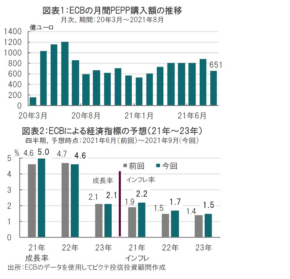 欧州中央銀行(ECB)は2021年9月9日に政策理事会を開催し、政策金利などの政策を据置く一方で、新型コロナウイルス危機対応として設定した総額1兆8500億ユーロ(約240兆円)の緊急買い取り制度(PEPP)について、債券購入ペースの縮小を決めました(図表1参照)。