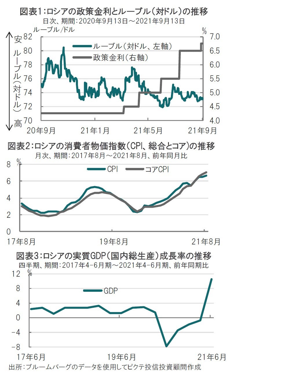 ロシア中央銀行は2021年9月10日の金融政策会合で、 政策金利(1週間物レポ金利)を0.25%引き上げ6.75%としました(図表1参照)。市場予想は過半が0.5%引き上げて7%とすることを見込んでおり、小幅な利上げとなりました。