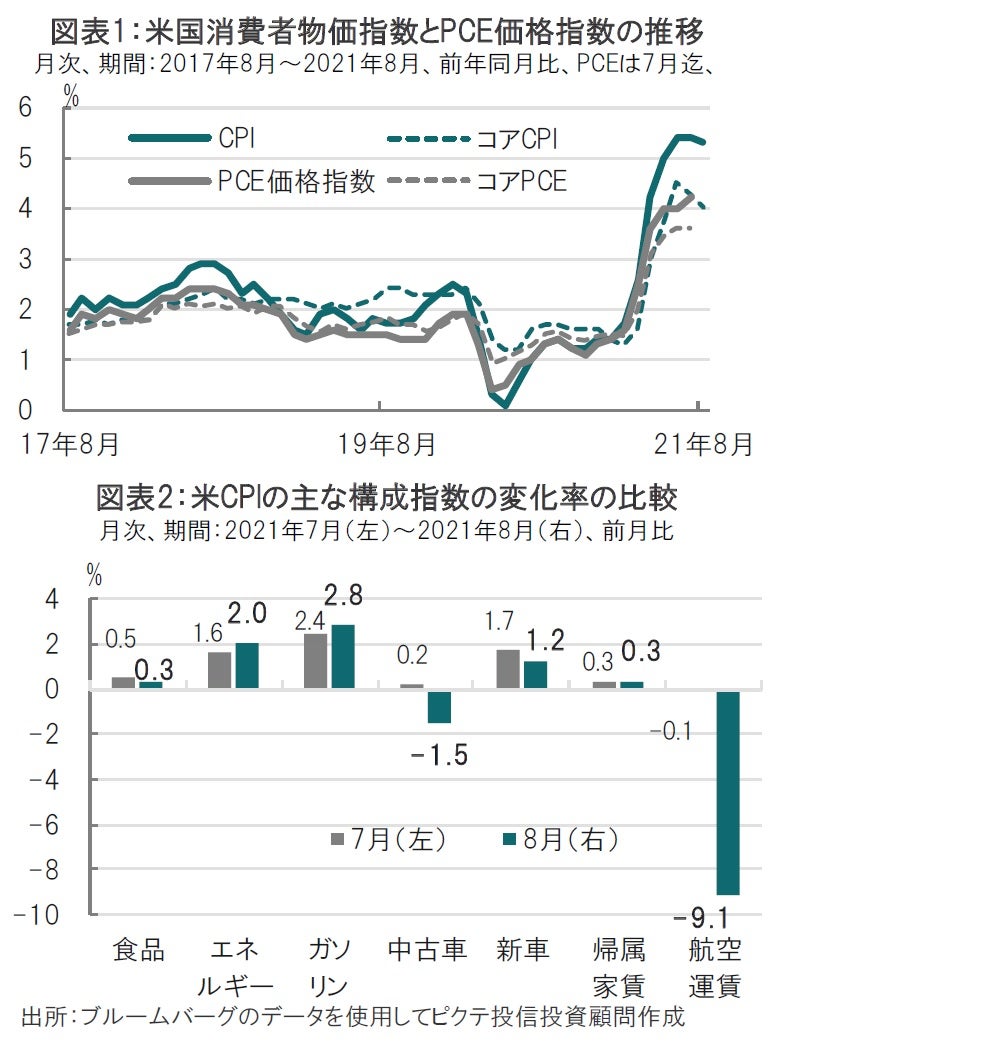 米労働省が2021年9月14日に発表した8月の消費者物価指数(CPI)は前年同月比の上昇率が5.3%と、前月の同5.4%を下回りました(図表1参照)。価格変動の大きい食品とエネルギーを除いたコアCPIは同4.0%と前月の同4.3%をやや大幅に下回りました。