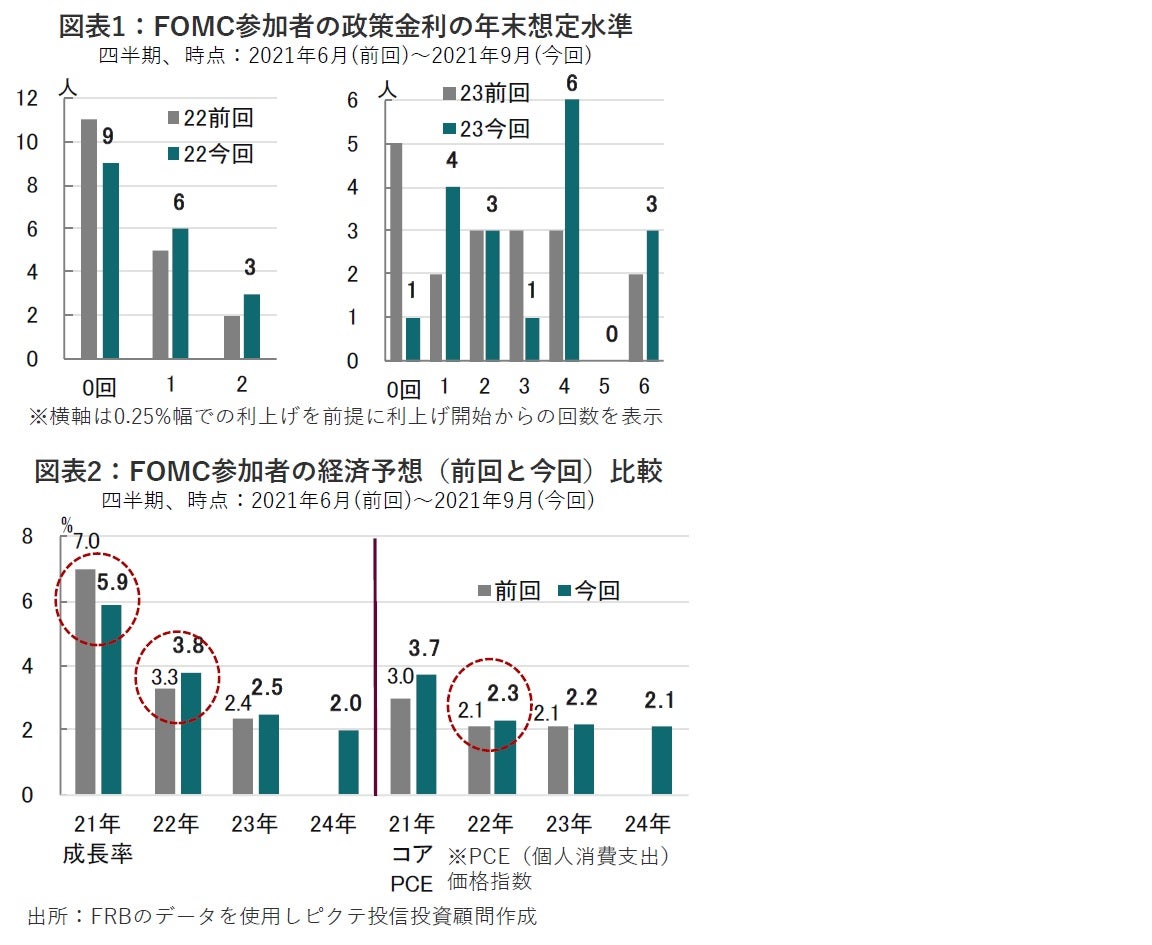 次に、FRBがドットチャートで示したFOMC参加者の想定する政策金利水準を利上げ回数に置き換えたものを見ると(図表1参照)、前回6月に比べ22年の利上げを支持する参加者が増えました。結果、利上げと据置き支持がそれぞれ9名で拮抗することとなりました。