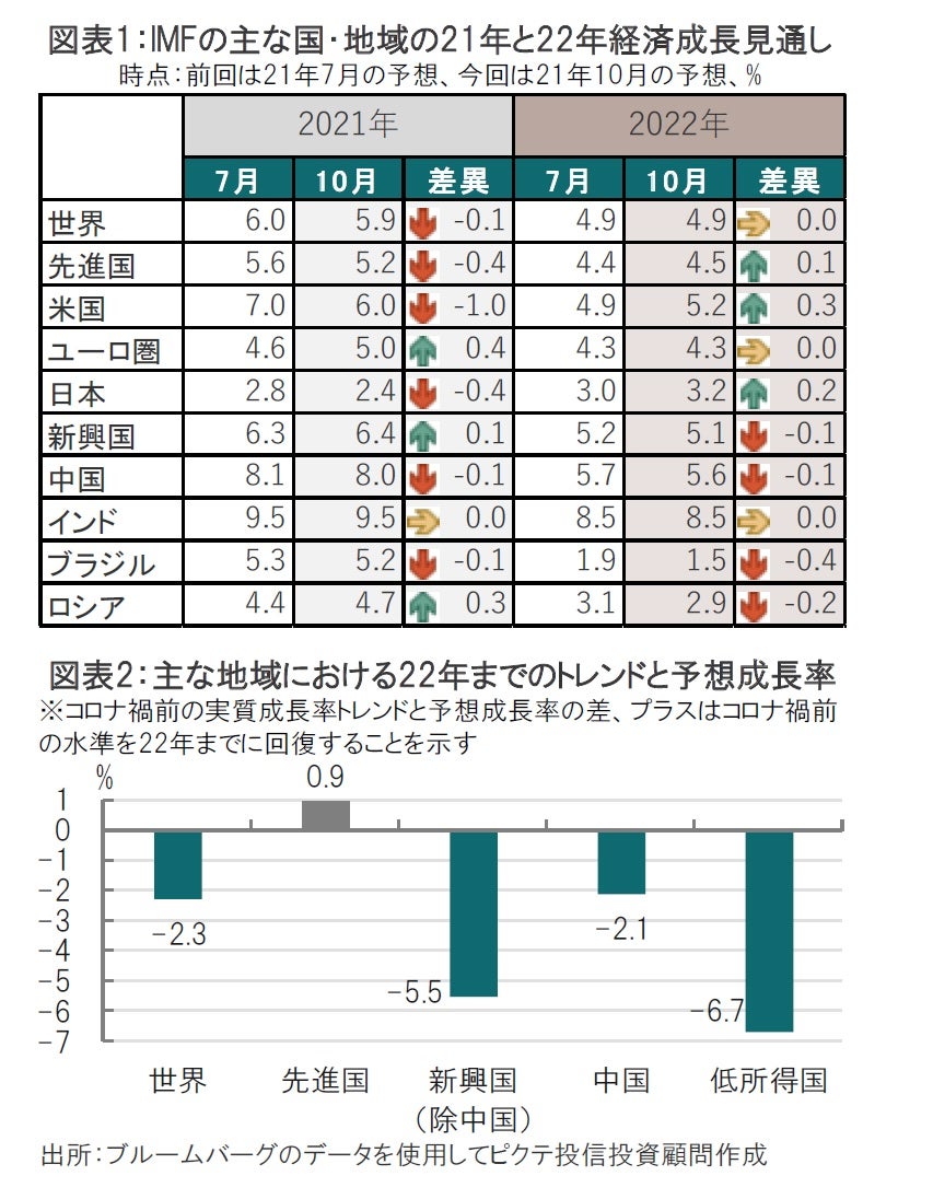 国際通貨基金(IMF)は2021年10月12日に最新の世界経済見通し(WEO)を公表しました。今年の世界成長率見通しを前回(7月)と比べ小幅ながら下方修正しました(図表1参照)。新型コロナウイルス禍からの堅調な回復を見込んでいるものの、回復の勢いの低下と国・地域間の格差の拡大に懸念を表明しました。