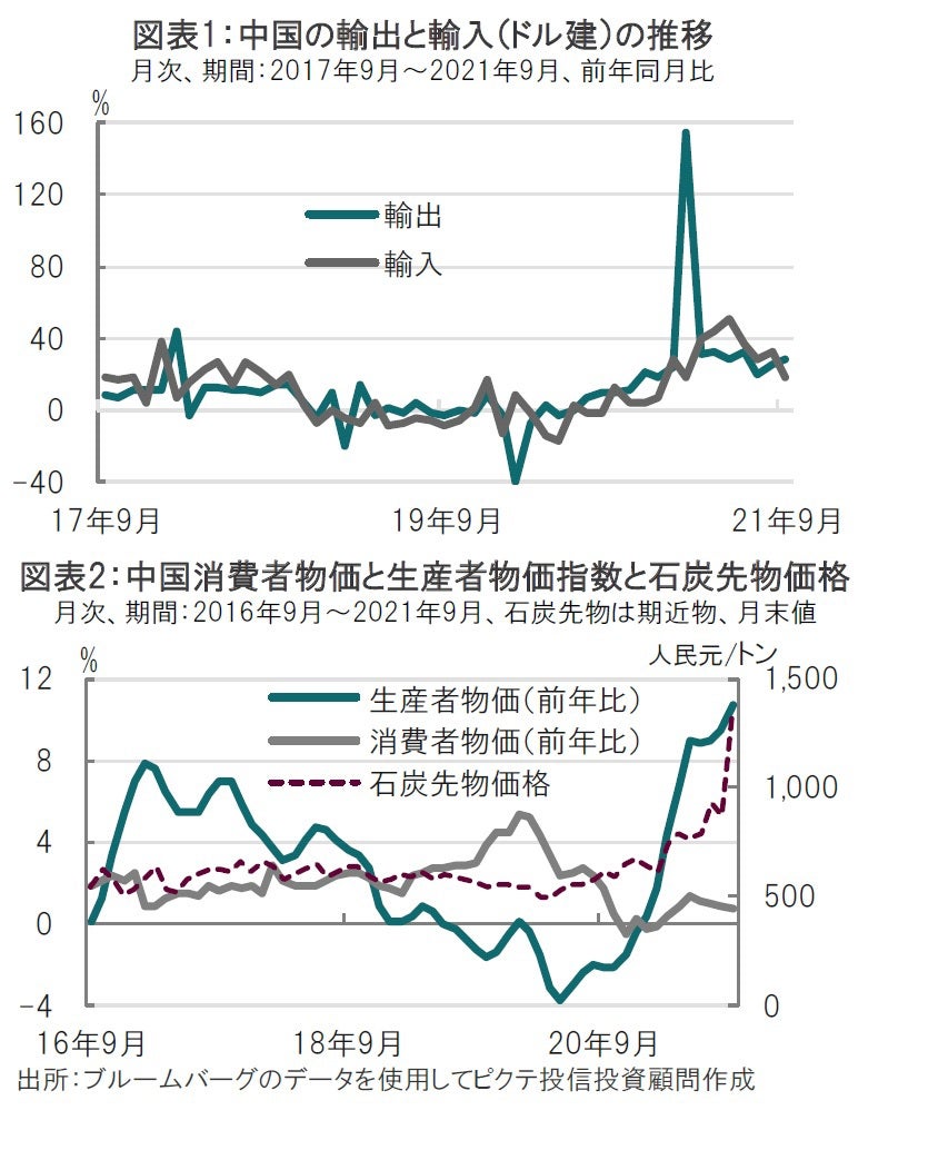 中国税関当局が2021年10月13日に発表した9月の貿易統計で輸出は前年比28.1%増で市場予想、前月を共に上回りました(図表1参照)。輸入は17.6%増と、市場予想、前月を下回りました。貿易収支は大幅な黒字となりました。