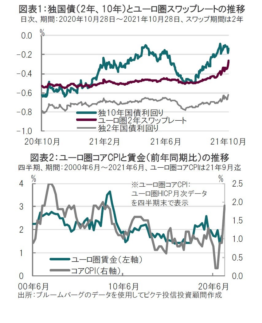 しかし9月のユーロ圏のインフレ率を実績値で見ると総合のインフレ率は前年比3.4%増で、食糧やエネルギーを除いたコアインフレ率も同1.9%と急上昇しました(図表2参照)。市場では急速に利上げを織り込む動きが見られ、従来安定していたスワップレートは足元上昇しています。市場では22年9月以降の利上げ開始を織り込み始めています。