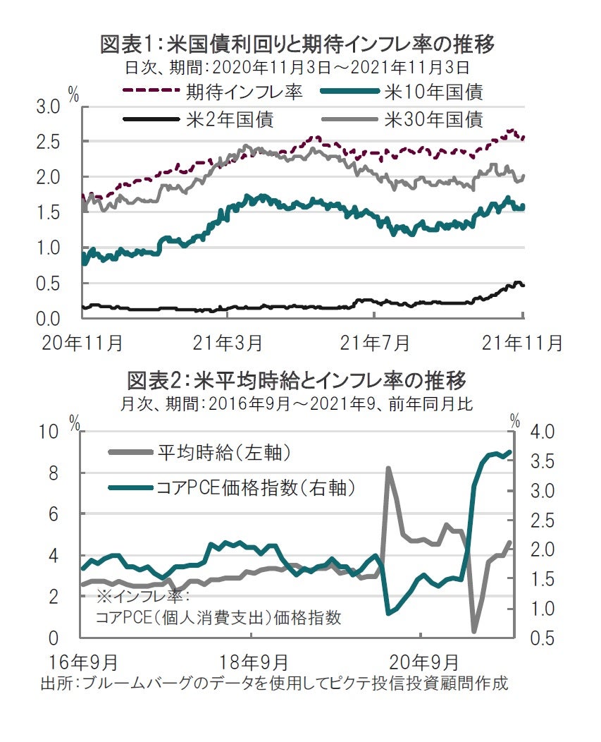 一方で、不確実性が残るのが利上げの時期です。不確実性を生み出す要因のひとつが「一時的」と表現してきたインフレ率が徐々に長期化していることです(図表2参照)。そこで今回の声明文では一時的と「想定される」要因と表現を変更しました。これは忍耐強くインフレが落ち着くのを待つ姿勢を正当化するための調整と見られます。パウエル議長の会見から判断すると、一時的には時間的な捉え方(例えば数ヵ月といった意味)と、インフレ率が上昇してもいつかは下がるという捉え方があると見られます。今回の表現の変更は時間的な柔軟性の高い後者の解釈を前面に押し出すことを意図していると見られます。もっとも、数ヵ月で終わると思っていたインフレが思ったより長期化したのでこれを正当化したというのが、本音なのかもしれませんが。