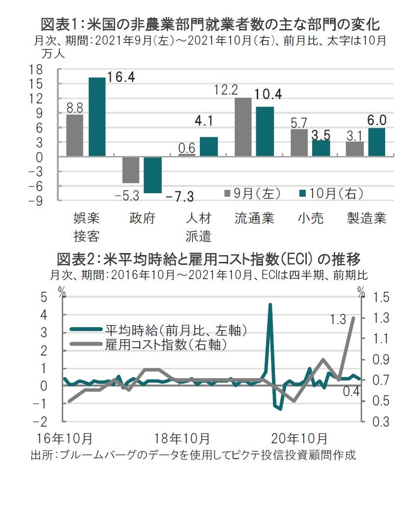 しかし、インフレ懸念を背景に市場の一部は、来年2回程度の利上げを見込む動きと見られます。インフレ動向を占う上で賃金の動きがカギを握ると見られます。10月の平均時間あたり賃金は前月比0.4%と、前月を下回りましたが過去と比べ比較的高水準です(図表2参照)。ただ、賃金データは解釈に注意が必要です。例えば、平均賃金は娯楽接客部門など低賃金部門の雇用が減ると平均賃金が大きく変動する傾向が見られます(図表2参照)。平均を算出するときのウェイトが雇用者数により変化するからです。そこで、そのような影響を調整した雇用コスト指数(ECI) を見ると、7-9月期は前期比1.3%と急上昇しました。ECIの過去20年の平均である約0.67%を大幅に上回ります。数字からはインフレ懸念が高まっているように見られます。ただ、賃金上昇の背景には雇用者の確保が困難なことから賃金引き上げを余儀なくされている中、高賃金を求め転職をする動きが、本来の賃金トレンドを押し上げている可能性もあります。賃金に対する多方面からの分析作業が今後は重要になると見ています。