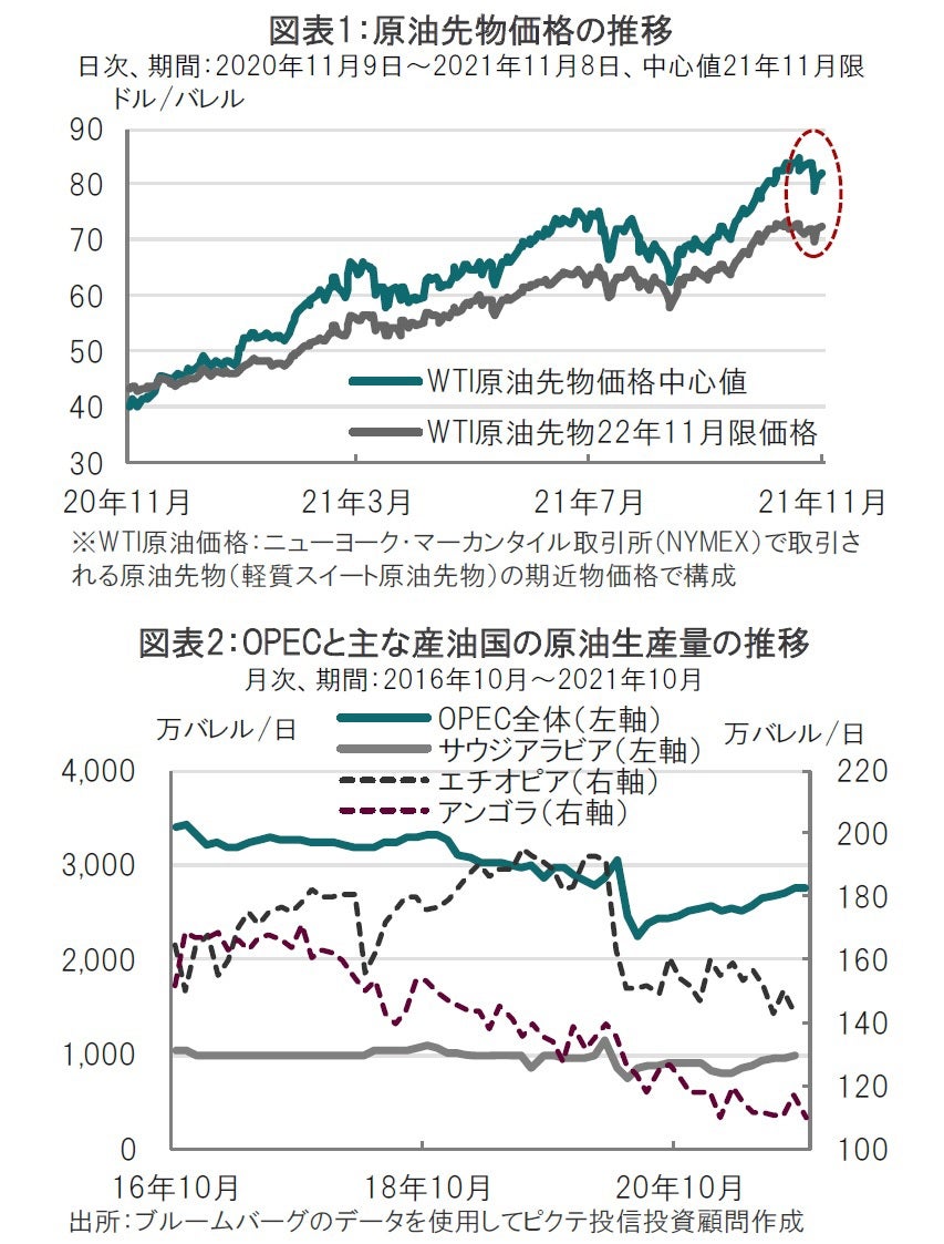 原油価格の上昇傾向が続いています(図表1参照)。原油高によるインフレ懸念に頭を悩ます米国などはOPECプラス会合を前に石油生産の増産を求めましたが結果はほぼゼロ回答でした。インフレを抑えたい米国は即座に反応し、米経済を守るために「あらゆる手段」を検討すると表明しています。原油価格は経済から政治問題も絡んだ複雑な様相を呈しています。