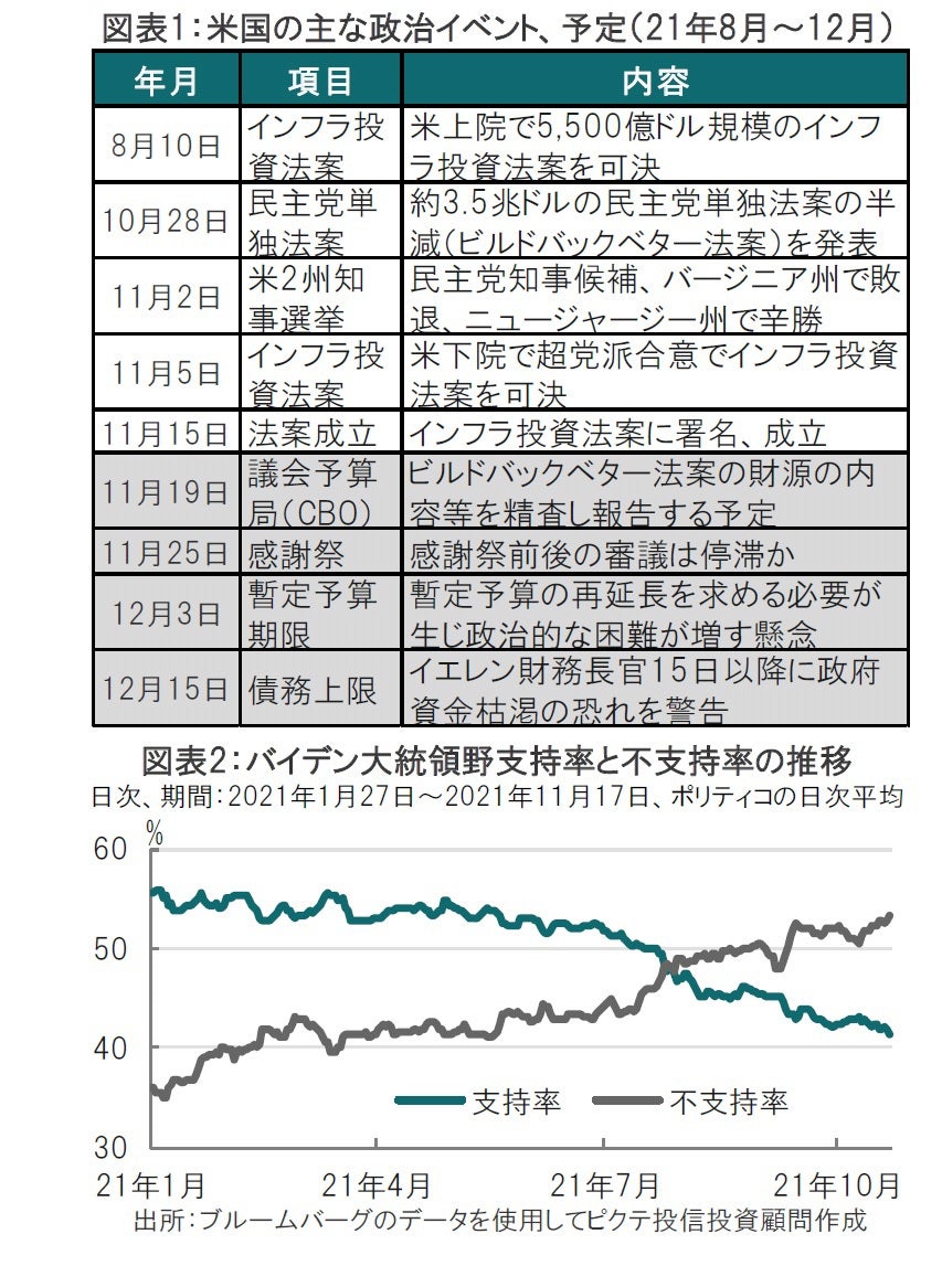 一方、当初は3.5兆ドル規模とより大型の民主党単独法案は、ビルド・バック・ベター(よりよき再建)法案に置き換え、規模を半減させ成立を目指していますが、採決の時期も不透明です。特に上院の先行きが不透明です。上院は民主党と共和党が議席数で拮抗しており、民主党内から1人でも反対が出れば、それを上回る共和党からの支持が必要となります。しかし、インフラ投資法案と異なり、分配の色合いが濃いビルド・バック・ベター(よりよき再建)法案で共和党の協力が得られる可能性は低いと思われます。