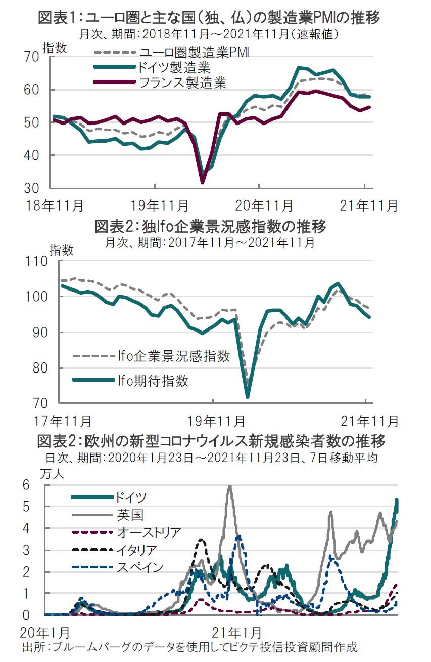 IHSマークイットが2021年11月23日に発表したユーロ圏の11月の製造業購買担当者景気指数(PMI)は58.6と、市場予想の57.4、前月の58.3を上回りました(図表1参照)。