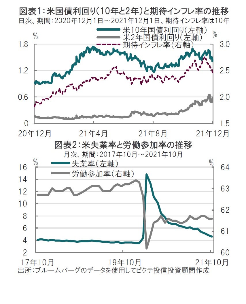 今回の2日間の議会証言を通じて、FRBのパウエル議長は、よりタカ派(金融引締めを選好)にシフトした印象です。新たな変異株であるオミクロン株の懸念が漂う中でもインフレ対応を重視する考えを示唆したからです。米国債市場では短期金利は利上げを織り込む一方で、長期金利は景気鈍化懸念などを背景に利回りは低下傾向(図表1参照)となるなど異なる反応が見られます。