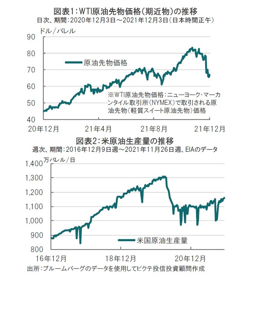 米国はシェールオイルを背景に押しも押されぬ産油国です。しかし足元の米国の原油生産量はコロナ禍前を200万バレル/日程度下回っています(図表2参照)。しかし米ダラス連邦準備銀行の調査では採算ラインの石油価格は50ドル/バレル前後と見られますが生産の回復は鈍いままです。米石油生産業者が、環境問題などを背景に石油開発投資を抑制していることが原因として考えられます。投資をする、しないは個別企業の判断ながら、政策も無関係とは言い難いと思われます。米国民のインフレに対する懸念が高まっています。インフレは本来は中央銀行の仕事ですが、コアインフレ率に含まれない石油価格には政治要因が深く関わることもあります。オミクロン株など市場動向と共に、政治要因にも当面は注意を払う必要がありそうです。
