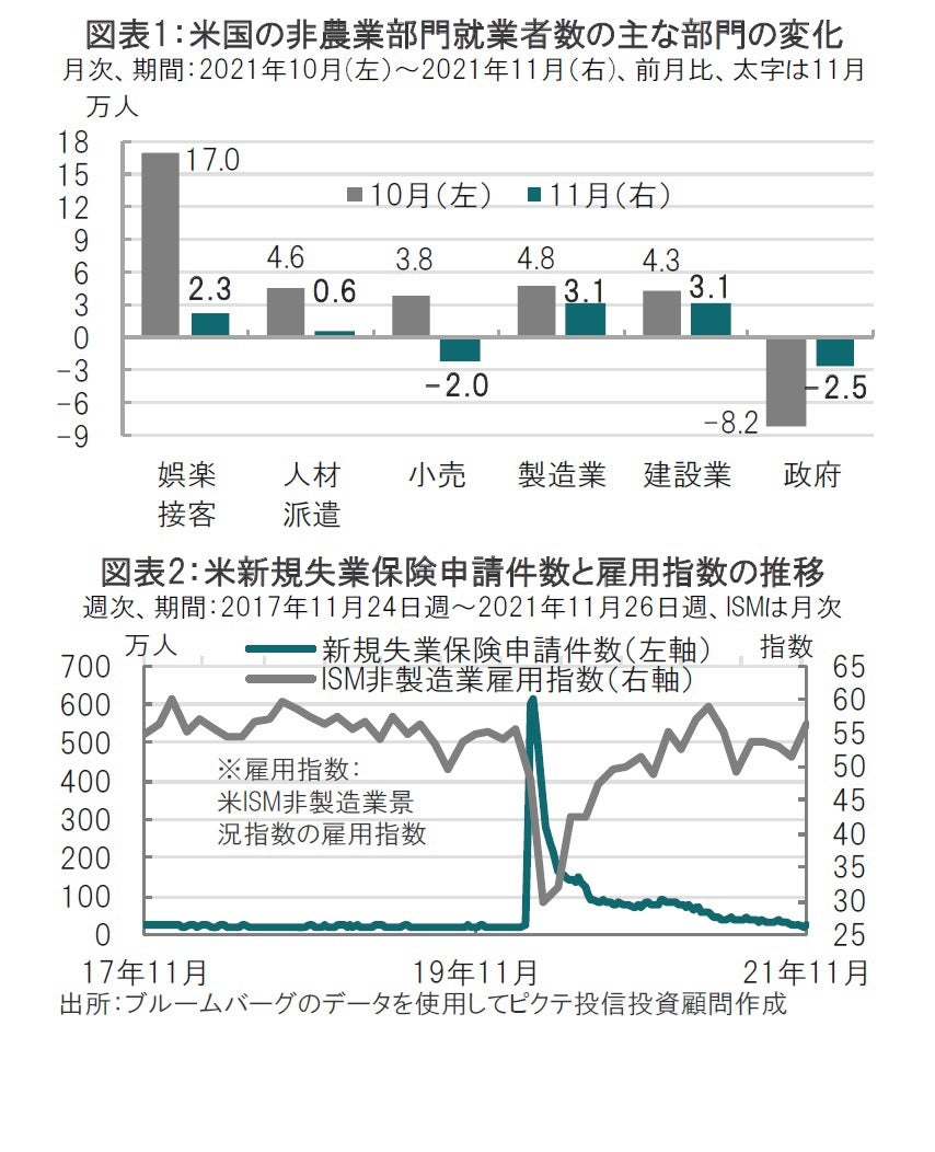 米労働省が2021年12月3日に発表した11月の雇用統計によると、非農業部門の就業者数は前月比21.0万人増と、市場予想の55.0万人増、10月の54.6万人増(速報値の53.1万人増から上方修正)を下回りました(図表1参照)。