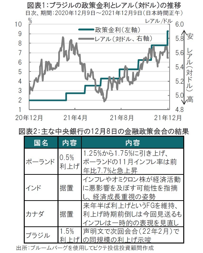 ブラジル中央銀行は2021年12月8日に開催した金融政策決定会合で、市場予想通り政策金利を1.5%引き上げて9.25%にすることを全会一致で決定しました。利上げは今年になり7会合連続となります(図表1参照)。