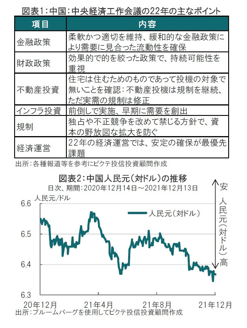 同会議は中国共産党が年に1度、翌年の経済運営の基本方針を決めるために開く経済分野の重要会議です。中国国営新華社など各種報道によると、中国指導部は同会議の閉会に際して22年の経済運営では、安定の確保が最優先課題だと表明しています(図表1参照)。
