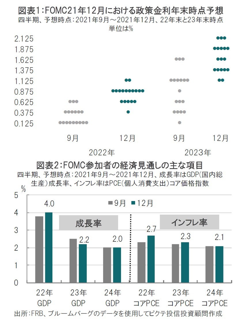 テーパリングの終了時期の想定を従来の来年6月から3月に前倒ししました。また、FOMC参加者らの政策金利見通しを反映するとされるドット・チャートでは、22年において3回の利上げが想定されており、9月時点の1回(中位数)の想定に比べ引締め姿勢となりました(図表1参照)。