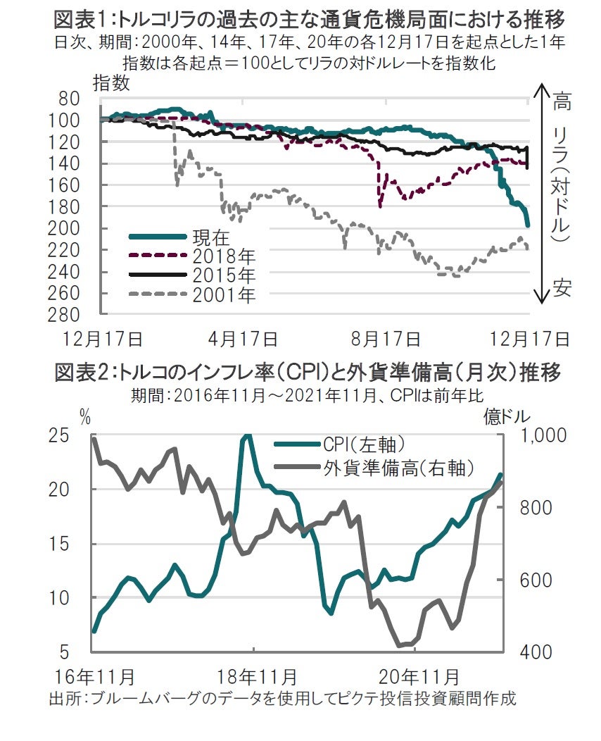 トルコでは通貨危機などと形容される局面が過去何度かありますが、主なものについて期間を固定し(12月~翌年12月)指数化により比較すると、今回のリラ安は底値が未だ見えない点で深刻な事態と見られます(図表1参照)。