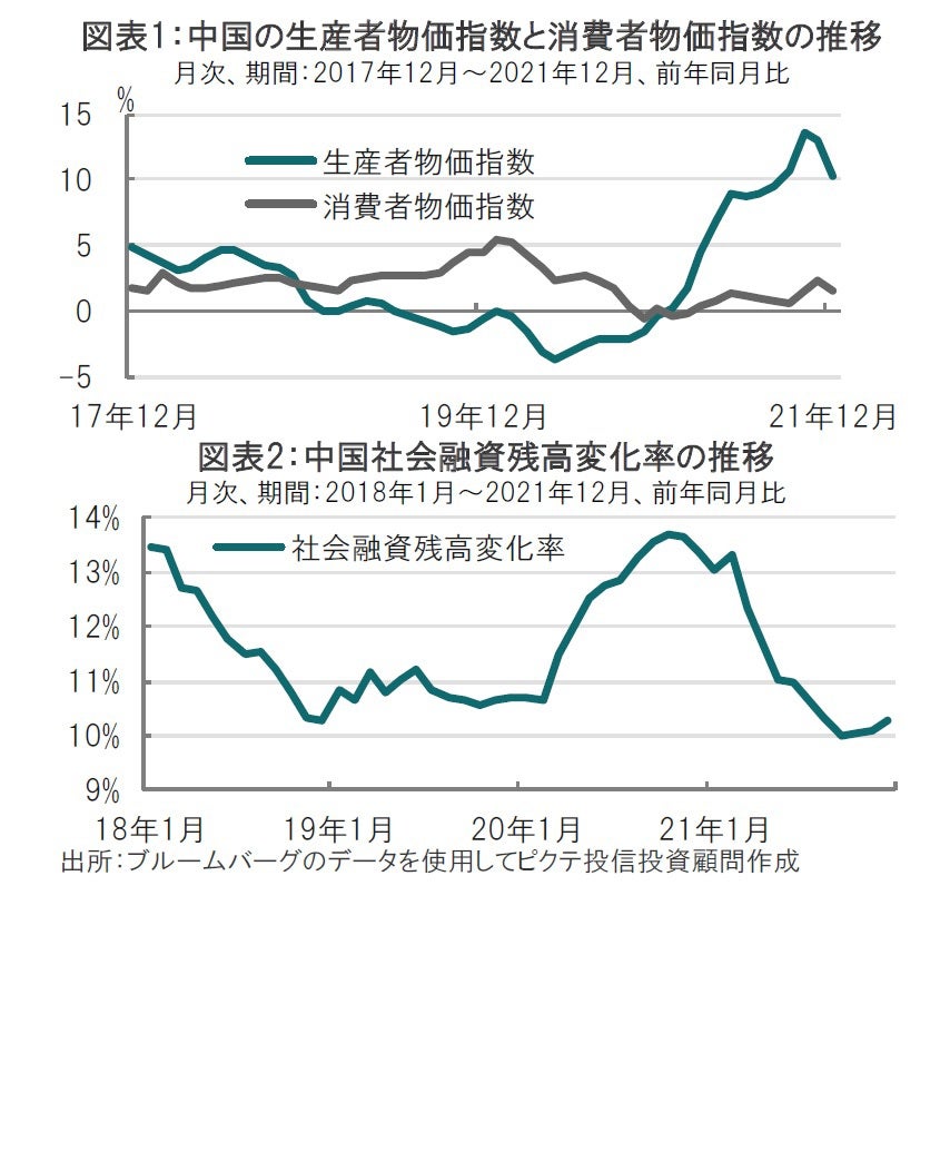 中国国家統計局が2022年1月12日に発表した21年12月の生産者物価指数(PPI)は前年同月比10.3%上昇と、市場予想の11.3%、11月の12.9%上昇を下回りました(図表1参照)。また、12月の消費者物価指数(CPI)は同1.5%上昇と、市場予想の1.7%上昇、11月の2.3%上昇を下回りました。