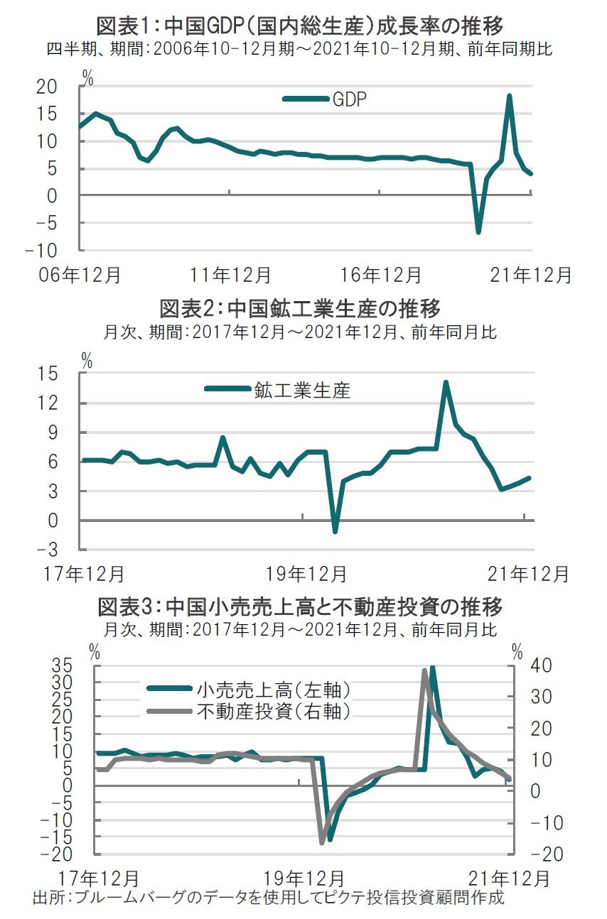 中国国家統計局が2022年1月17日に発表した21年10-12月期のGDP(国内総生産)は、実質で前年同期比4.0%増と、7-9月期の4.9%増から減速したものの、市場予想である3.3%増を上回りました(図表1参照)。