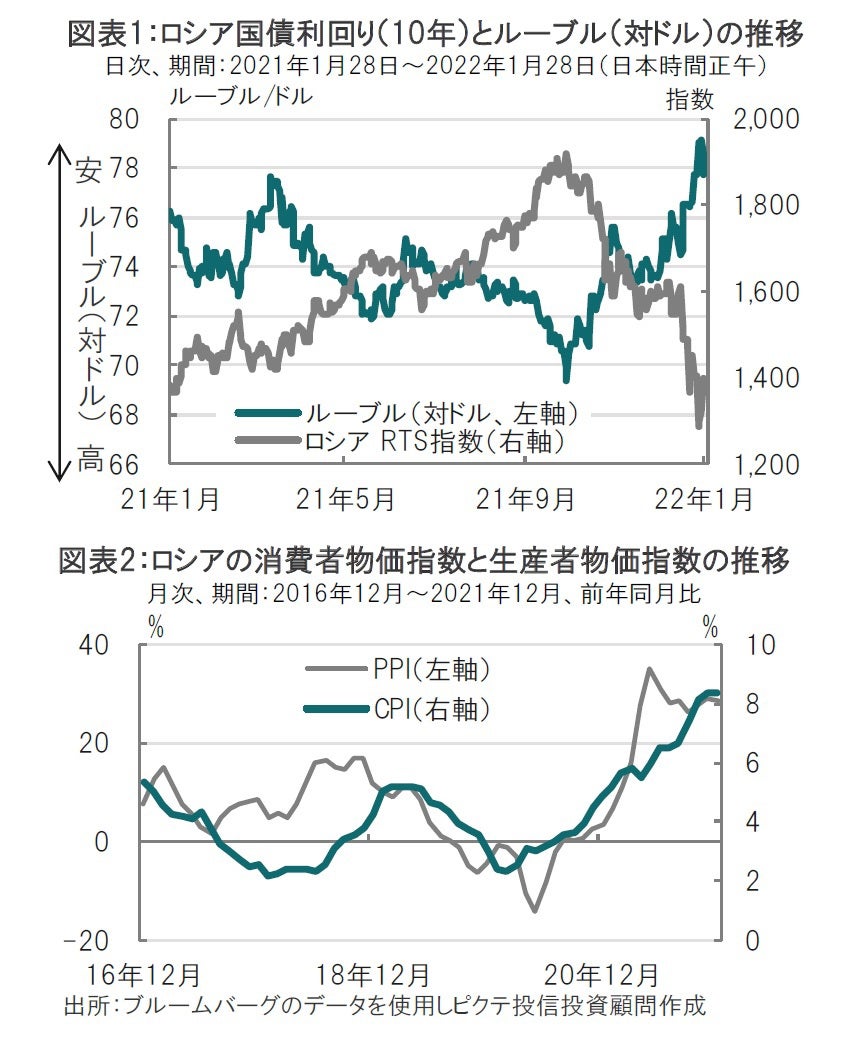 米国の回答を受けたロシアの反応などを背景に、市場ではルーブル高など交渉継続に安堵する動きが見られました(図表1参照)。問題解決には程遠い段階ながらルーブル高が見られたのは、この問題に市場が神経質なことの現われと見られます。