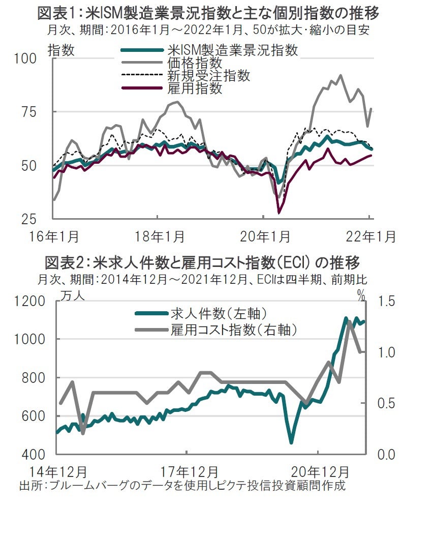 次に、インフレを占う上で、もっとも注目している賃金動向ですが、今後の動向を占うには確認する点が残されていると見ています。賃金動向を見る上で米連邦準備制度理事会(FRB)も参照していると思われる雇用コスト指数(ECI)を見ると、21年10-12月期は前期比1.0%と、市場予想の1.2%、前期の1.3%を下回りました(図表2参照)。ECIの評価ですが、上昇圧力を強める賃金に落ち着きの兆しのようにも見えます。しかしながら、この水準は年率では約4%と依然高水準です。また、賃金と相関の高い求人件数は21年12月も約1092.5万件とオミクロン株の感染が拡大する中でも高水準でした。先のISM製造業景況指数の個別指数でも雇用は改善傾向でした。