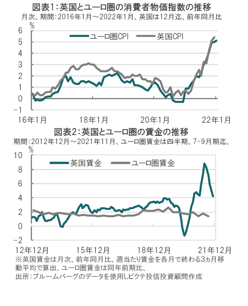BOE、ECBが共にタカ派姿勢を強めた主な背景はインフレ率の想定外の上昇と見られます。英国の21年12月のインフレ率は前年同月比で5.4%上昇、ユーロ圏の1月のインフレ率は5.1%上昇です(図表1参照)。英国とユーロ圏のインフレ動向は似ているようにも見えます。しかしながら英国のタカ派姿勢はユーロ圏より明確であったと見られます。市場ではBOEの次の利上げを5月と会合前は見込んでいましたが、5月の前に開催される3月会合での利上げを織りこんでいます。結果として、BOEはQTも前倒しすると見られます。