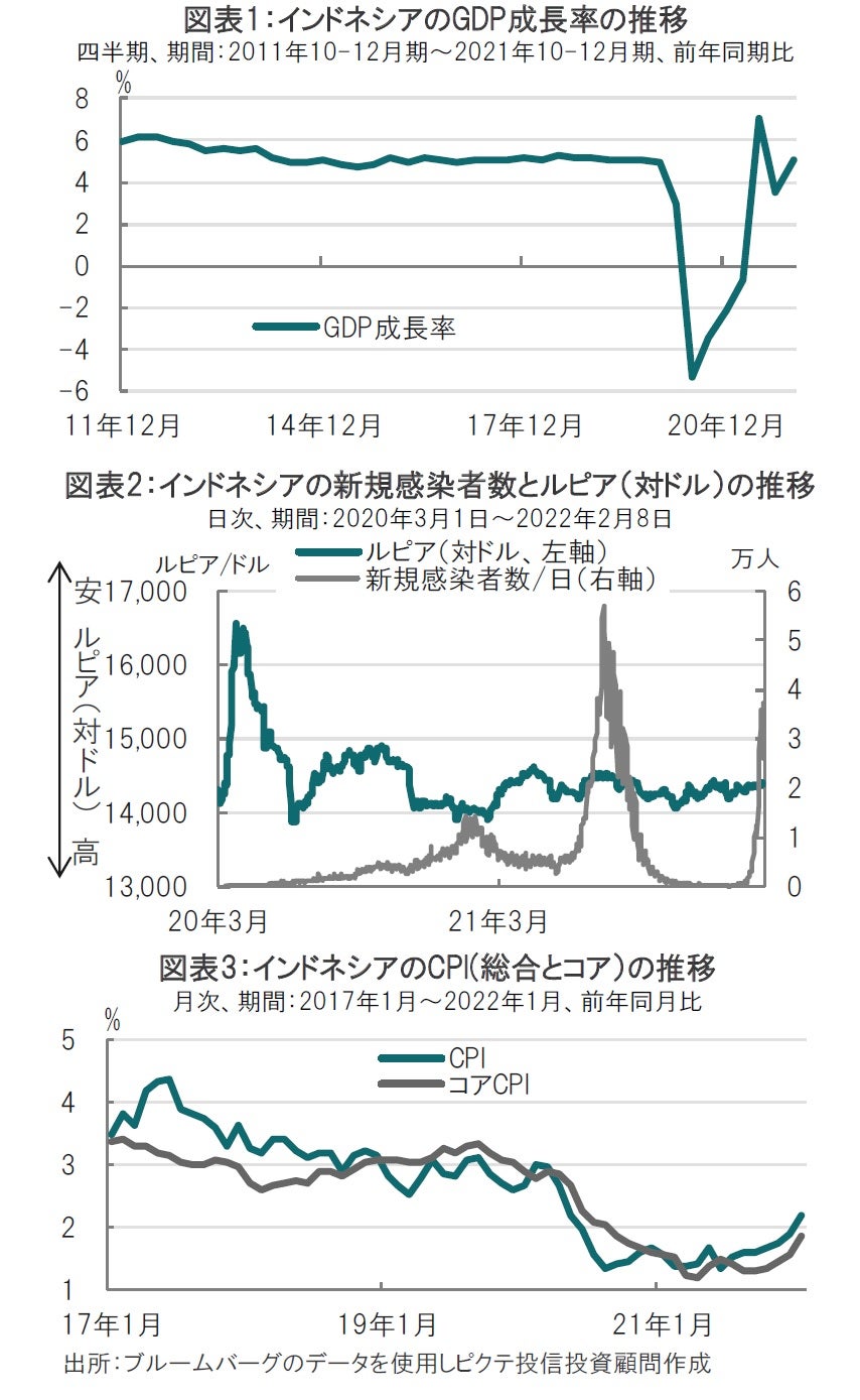 インドネシア中央統計局が2022年2月7日に発表した昨年10-12月期のGDP(国内総生産)成長率は前年同期比で5.02%増でした(図表1参照)。市場予想の4.81%増、前期の3.51%増を上回りました。前期比ベースでは3四半期連続でプラス成長を確保しており、回復傾向です。