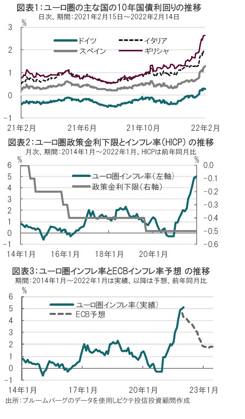 ECBのラガルド総裁が2月3日のECB政策理事会後の会見で年内利上げを否定しなかったこともあり、市場では年内利上げを織り込む動きが強まっています。結果として、ドイツとユーロ圏の他の加盟国との間の国債利回り格差(スプレッド)が拡大しています(図表1参照)。政策理事会後の会見でラガルド総裁は(利上げ観測で)ユーロ圏のスプレッドは拡大していないとの認識を示しました。市場の織り込みが進んでいます。