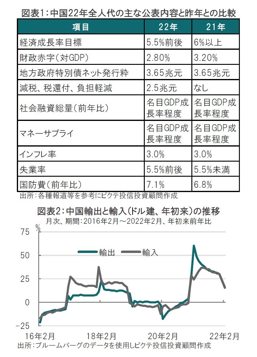 不動産規制の影響が残ることや、新型コロナウイルス関連の厳しい制限措置(ゼロコロナ政策)、足元ではロシアのウクライナへの軍事侵攻など向かい風が吹く中、昨年の成長率目標の6%以上から引き下げました。なお、全人代の会期は3月11日までとなっています。