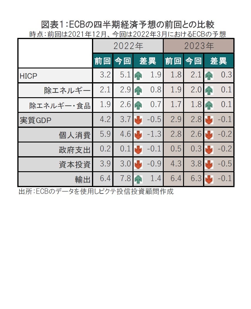 次に、データ次第となる経済予想を見ると、こちらも正常化を意識させる内容です。実質GDP(国内総生産)成長率は22年が3.7%と、ロシアの軍事侵攻の影響などを背景に前回(21年12月)から0.5%下方修正しています(図表1参照)。しかし市場はユーロ圏の成長率をより深刻に予想し始めています。ECBがこの程度の落ち込みしか想定しないのならば、ユーロ圏の景気に対しECBは強気とも見られます。
