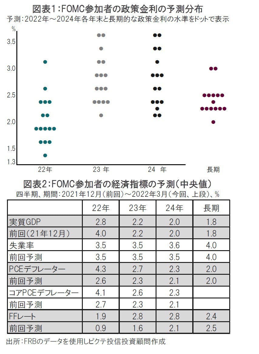 今回のFOMCにおける0.25%の利上げは想定通りです。一方ロシアの軍事侵攻を受けエネルギー価格が上昇する中、ドットチャートで年内利上げ回数を7回としたことや、インフレ見通しを引き上げた点で、FOMCのトーンはタカ派(金融引締めを選好)的であったと見られます。ただ、成長見通しの引き下げを迫られるなど、この先の政策運営に難しさがうかがえます。
