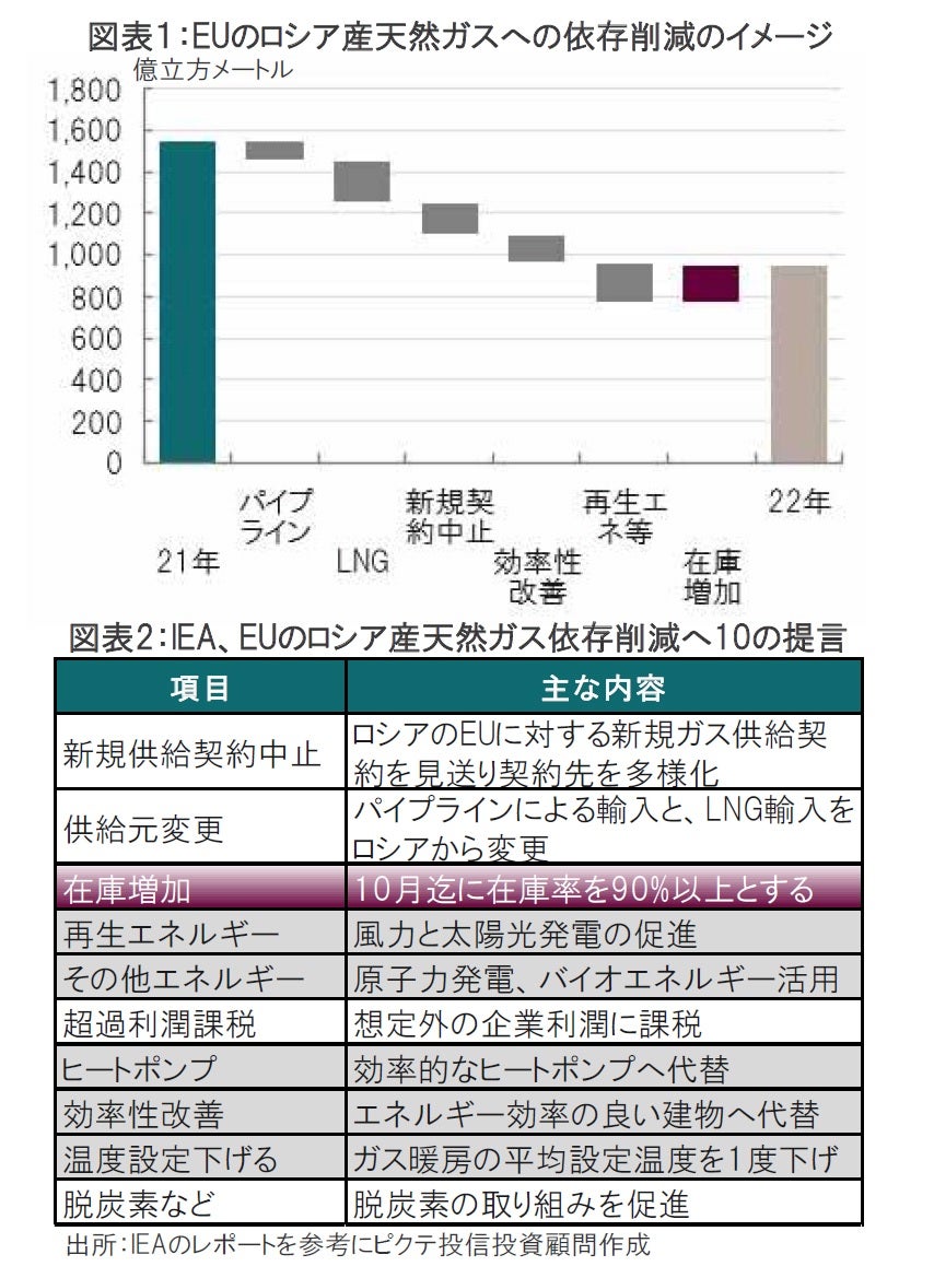 国際エネルギー機関(IEA)は3月月初に、欧州がロシアの天然ガス依存から脱却するための10の提言を行ったレポートを公表しました(図表2参照)。同レポートによると、EUが21年にロシアから輸入した天然ガスは1550億㎥で、内訳はパイプライン経由が1400億㎥、LNGが150億㎥となっています。同レポートによる提言通りとすれば22年末にはロシアからの輸入は1000億㎥を下回り、21年対比で3分の1程度を削減できると指摘しています。同レポートの提言内容を振り返りながらロシア産天然ガス輸入削減の展開を占います。まず、図表2にある新規供給契約中止は主にロシアの国営ガス供給会社の欧州向けガス供給契約のうち、22年に終了する契約を更新しないという内容です。結果として150億㎥程度の削減を見込んでいます。