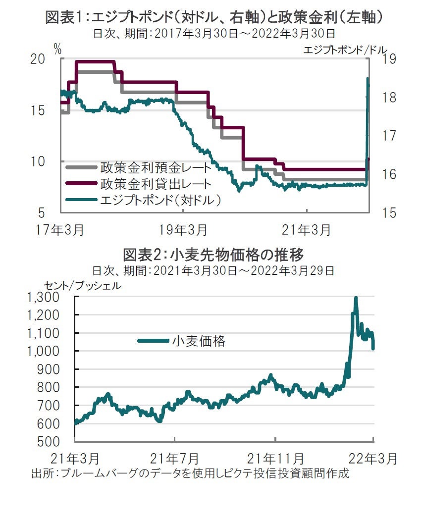 まず、通貨の切り下げと利上げを迫られたエジプトです。そのエジプトが通貨の切り下げや利上げを迫られた背景は、エジプト中銀の声明にあるようにインフレ圧力が強まったことです。エジプトのインフレ圧力は主に小麦価格の上昇が背景です(図表2参照)。エジプトは食料を輸入に依存する割合が高く、特に小麦は世界有数の輸入国です。輸入小麦の8割程度がロシアとウクライナからの輸入であることがエジプトの物価上昇圧力を押し上げたと見られます。小麦価格は急上昇のピークは過ぎましたが、ロシアの軍事侵攻前を大幅に超えた水準で推移することが想定されます。